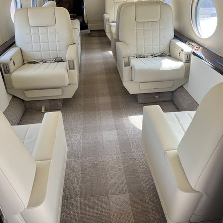 A complete refurbishment. Our design wins! Complete modern re-design of the cabin chairs. New carpeting. New lower dado panels. New entry and airstairs. A complete makeover! Special attention to use of Bull-hide leather which is derrived from all male cows. Although higher cost, but known for its unique hand and durable wear properties.